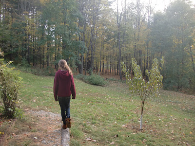 Lily in her favorite sweatshirt and moccasins. Our yard is through the woods on the other side.